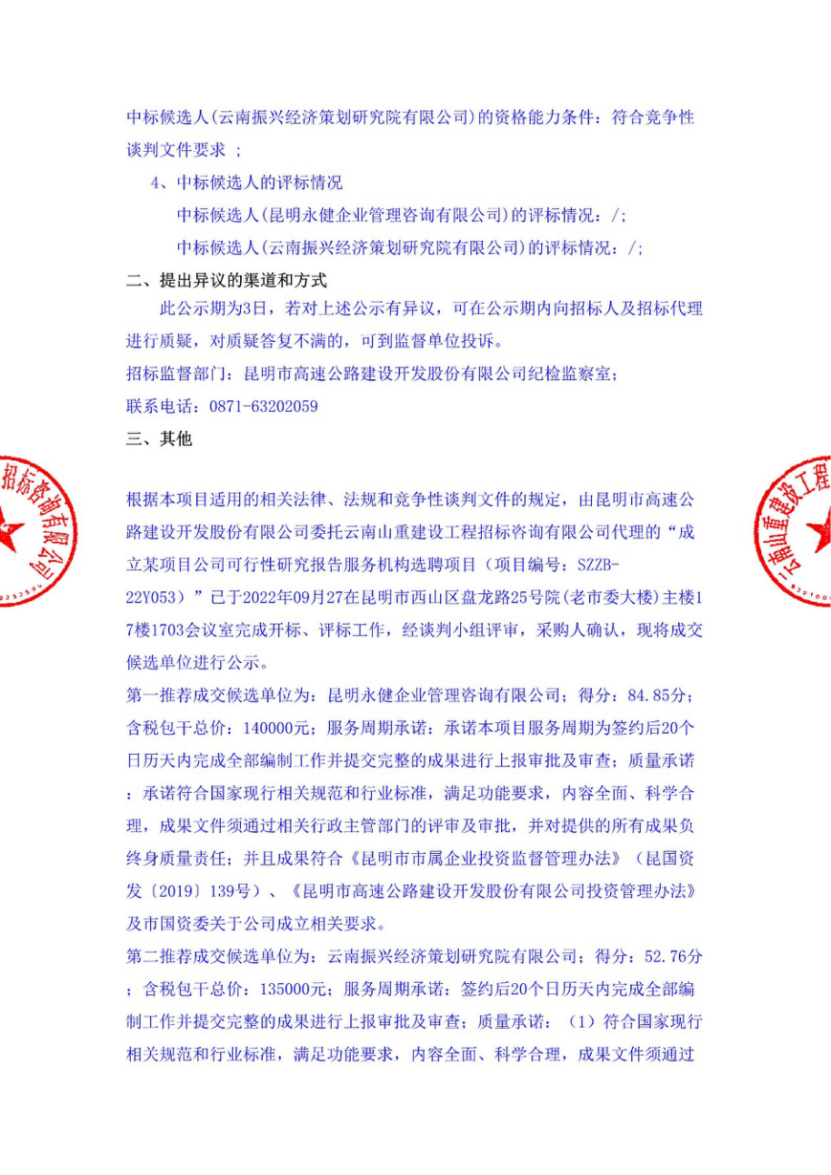 成立某项目公司可行性研究报告服务机构选聘项目中标候选人公示
