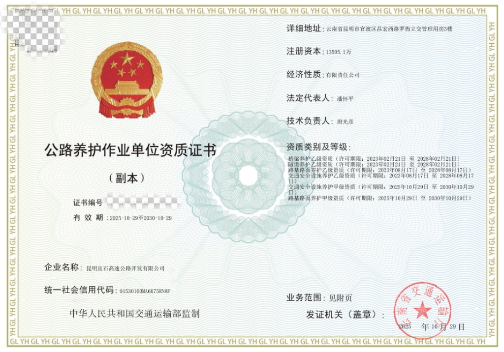 2025年10月29日,昆明高速公路公司下属宜石公司成功取得公路养护作业单位“交通安全设施养护甲级资质”与“路基路面养护甲级资质”两项重要资质证书。截至目前,宜石公司已陆续取得多项养护资质,包括桥梁养护乙级资质、隧道养护乙级资质、交通安全设施养护甲级资质和路基路面养护甲级资质。这些资质的取得,全面覆盖了高等级公路养护的关键业务领域,形成了较为完整的资质链,标志着昆明高速公路公司在资质建设方面迈上了新台阶。这不仅为公司进一步拓展公路养护板块业务、增强市场综合竞争力奠定了坚实基础,也为公司未来参与更广泛、更复杂的大型养护项目提供了准入保障和发展动力。