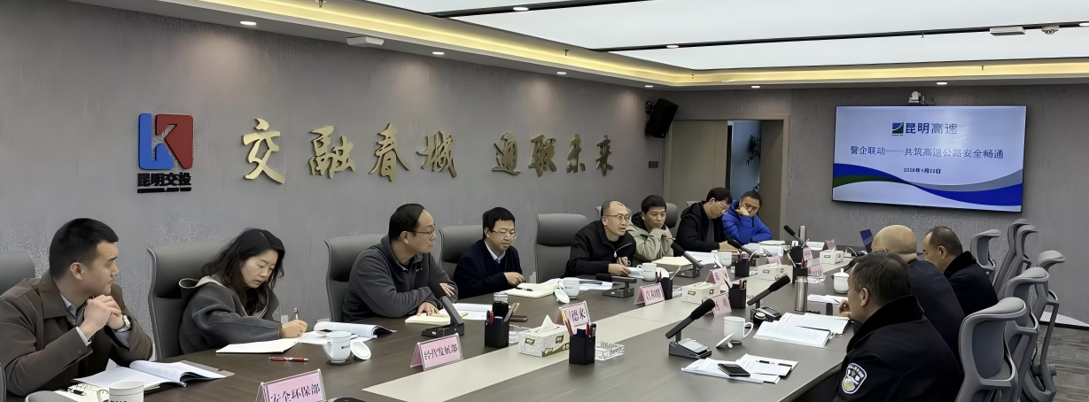 2026年1月22日,昆明高速公路公司主持召开了“警企联动—共筑高速公路安全畅通”交流座谈会。会议特邀昆明市公安局交通管理支队支队长杨明一行出席。昆明高速公路公司党委书记、董事长袁和耀,党委委员、总经理陈铖,党委委员、副总经理刘德来及相关部门负责人,下属公司(内、外环高速公路)负责人参加会议。